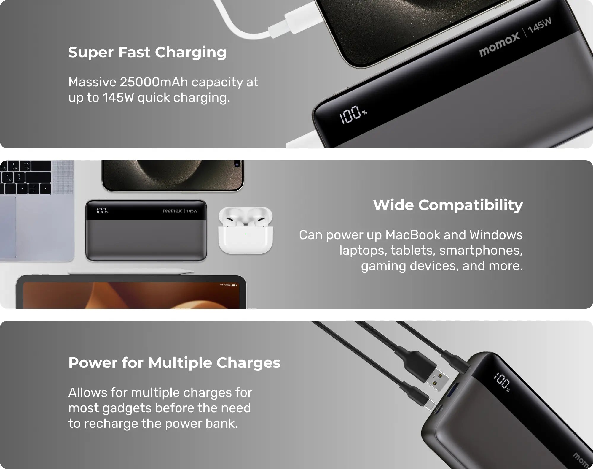 Equipped with PD 3.1 technology, the 1-Power Ultra mobile power bank can provide fast charging speeds of up to 145W, which can not only charge your mobile devices, but also charge Macbooks or Windows laptops.