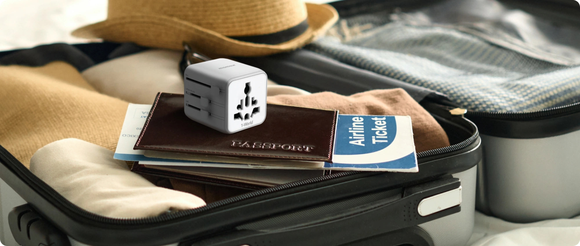 Weighing only 98g, 1-World Universal Travel Adapter with Dual AC is designed to be portable and easy to pack.