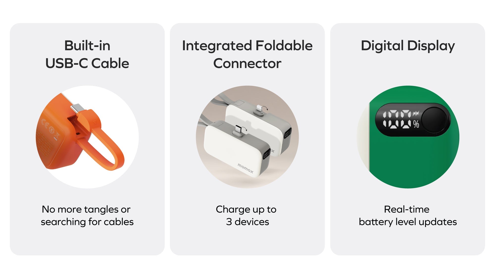 Unique three-output design | Equipped with folding charging plug, USB-C cable and USB-C socket to solve the charging needs of different devices