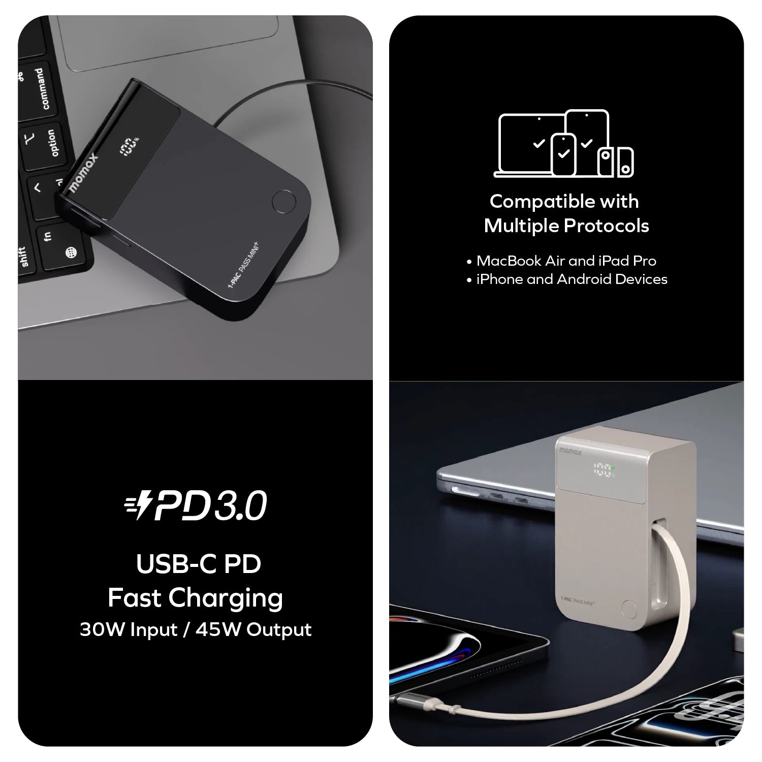 Pass Mini⁺ 以超輕巧優質機身, 集 45W PD 極速充電、三路同步輸出、數碼顯示監控及內置可伸縮線材於一身。